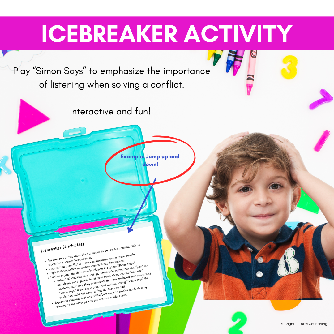 Looking for a ready to use conflict resolution and peacemaking lesson for your primary students? This conflict resolution classroom guidance lesson is designed to be used with Pre-K to 1st-grade students in a tier 1 class lesson setting. By using an engaging icebreaker, fun activities, and interactive games, students will learn the strategies they need to peacefully resolve conflicts with their peers.