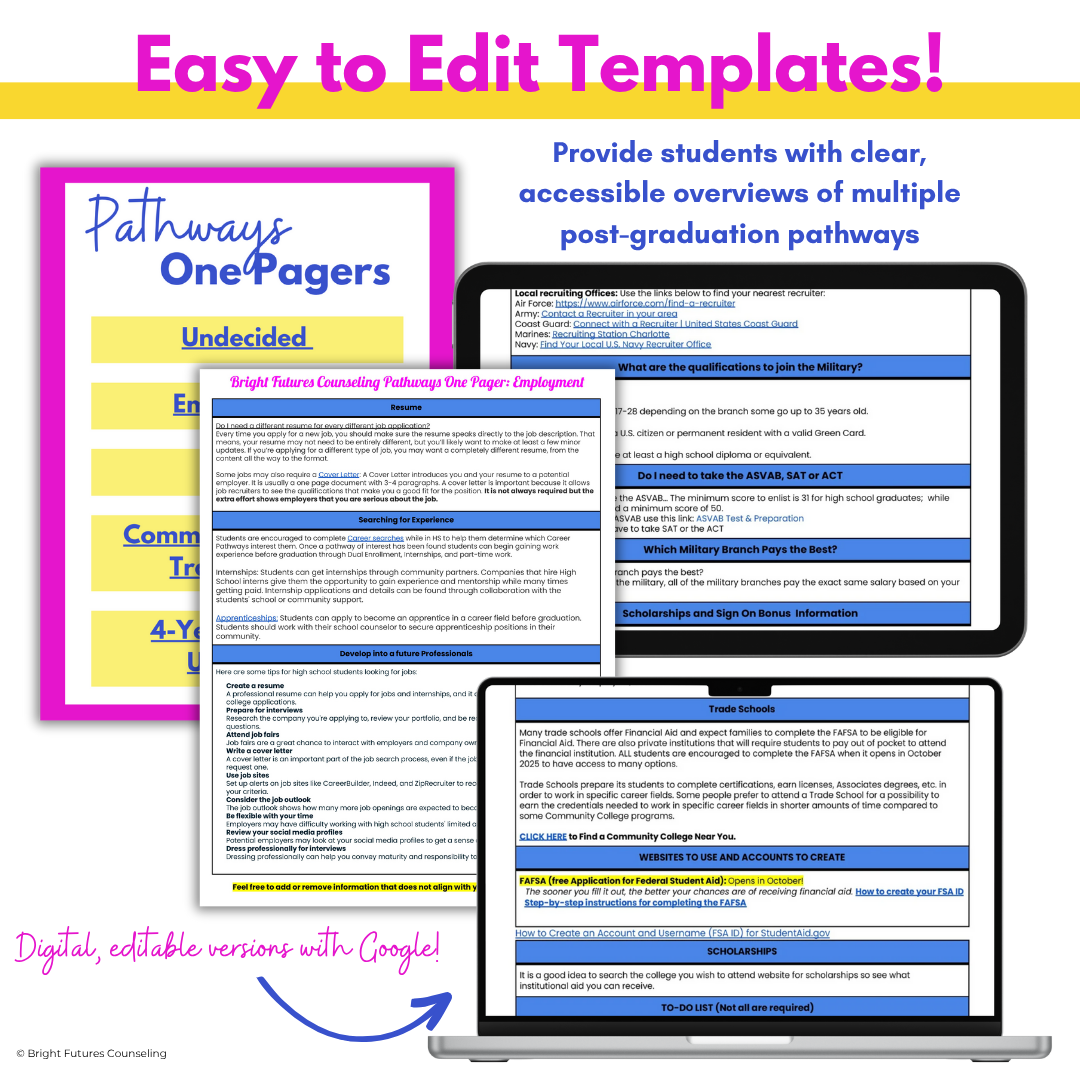 Help your high school seniors determine their post-graduation plans with these post-secondary pathways one-pagers! These post-graduation pathways information sheets provide students with clear, accessible overviews of multiple post-graduation pathways, including employment, military service, community college or trade school, and four-year universities. Each one-pager offers key information, helpful links, and next steps to support students in exploring their options and planning for life after high school—whether they are undecided or pursuing a specific direction.