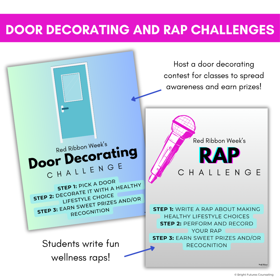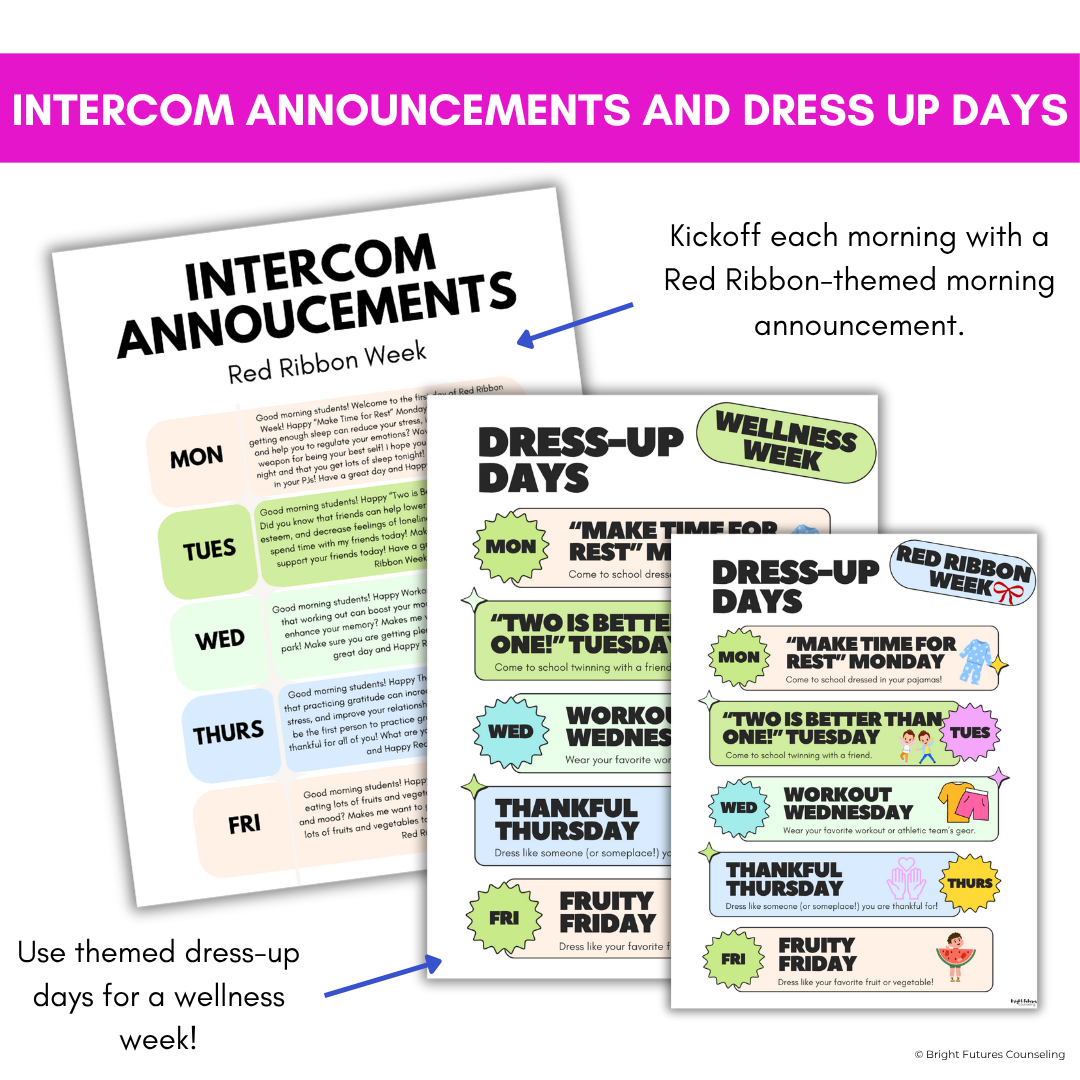 This Red Ribbon Week Toolkit is designed to help counselors facilitate a red ribbon or wellness week with ease! You’ll have everything you need from class lessons and morning announcements to dress-up day and door decorating themes! Introduce drug prevention and making healthy choices by bringing awareness to Red Ribbon Week through these fun events and activites!